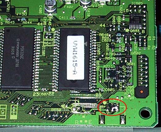 改造箇所のアップです。 赤丸部分に3箇所接点があります。 写真ですと真中と右をショートさせます。 あとは基盤と蓋を元に戻して完了です。