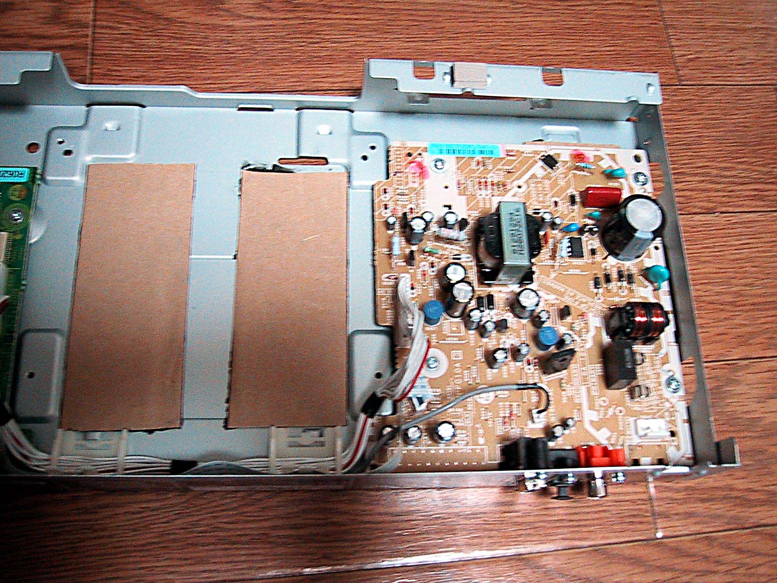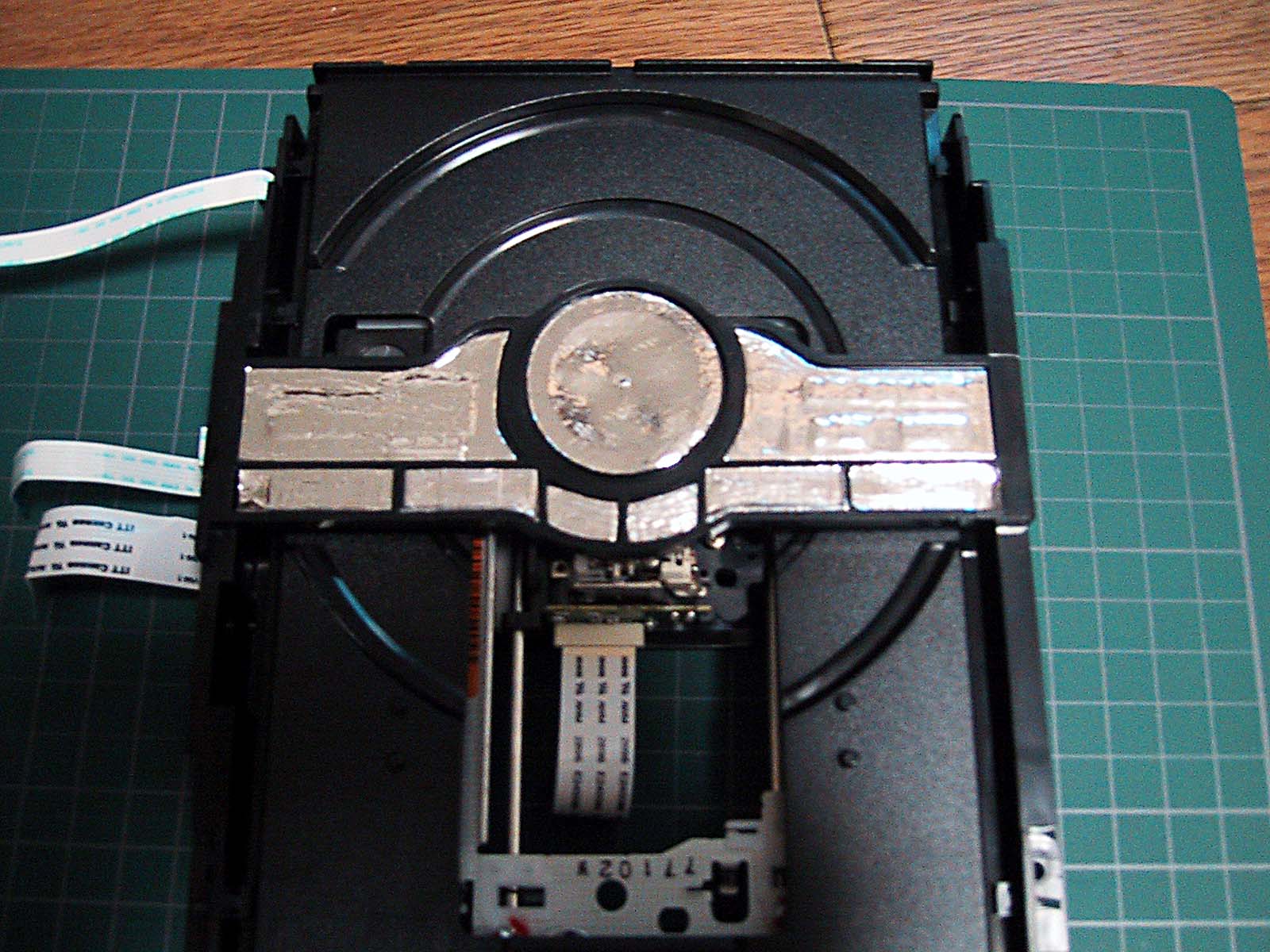 フロントのディスクトレイが出てくる部分のパーツに鉛シートを貼る。