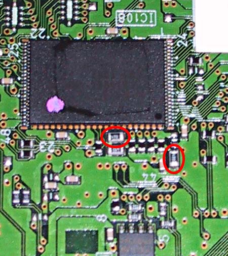 変更する抵抗は小さい赤丸の部分です。 また、セットアップメニューを表示するため大きい赤丸のEEPROMも交換しました。