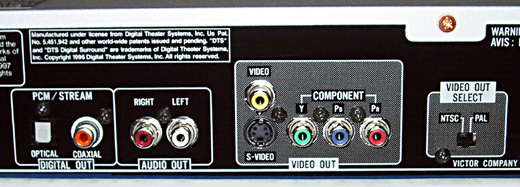 映像出力は、コンポジット、S-VIDEO、コンポーネント 音声出力は、アナログ2ch、デジタル光、デジタルコアキシャル 映像出力の切り換えも背面にある。