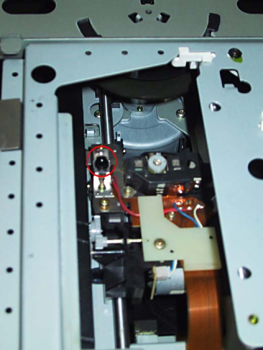 ピックアップ脇にディスクを認識するセンサーがあります。 この部分を綿棒などで拭きます。