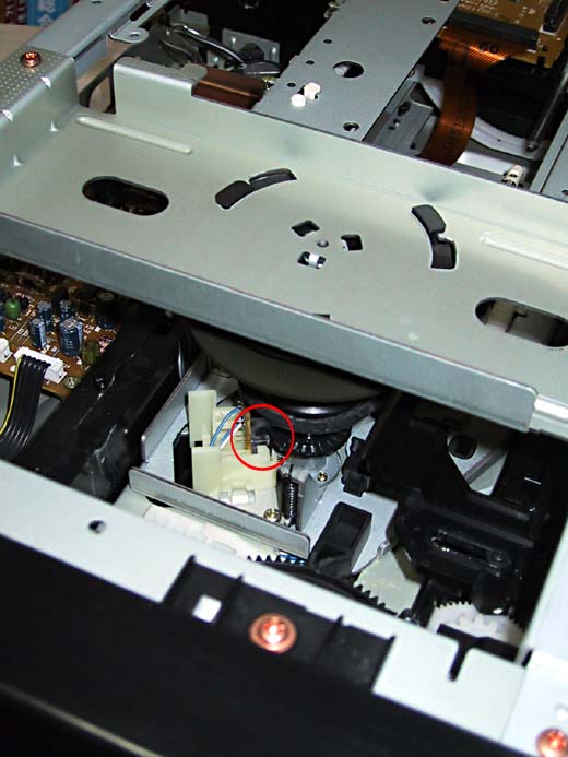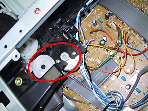 ディスクトレイを出した状態。写真赤丸で囲んだ部分ゴムベルトでトレイを動かす部分ですが汚れでスリップすることが多いのでゴムベルトを外し、ベルト、プーリー共に汚れをふき取ります。