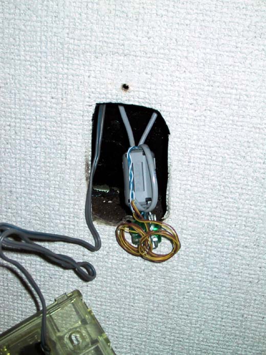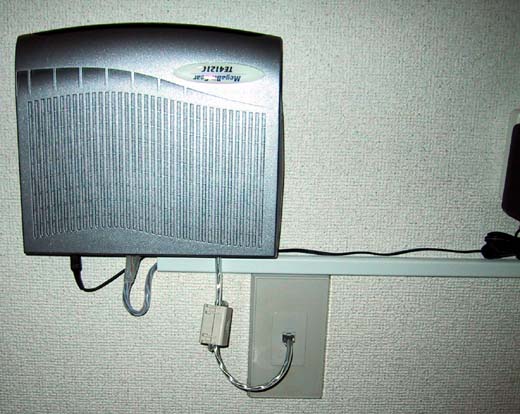 最初に取り付けたのはもう一本の電話線(ISDN)が引き出されているモジュラージャックの中です。 ここまではISDNと平行に線が来ているのでこれも安定しない原因なのかもしれないのですが・・・
