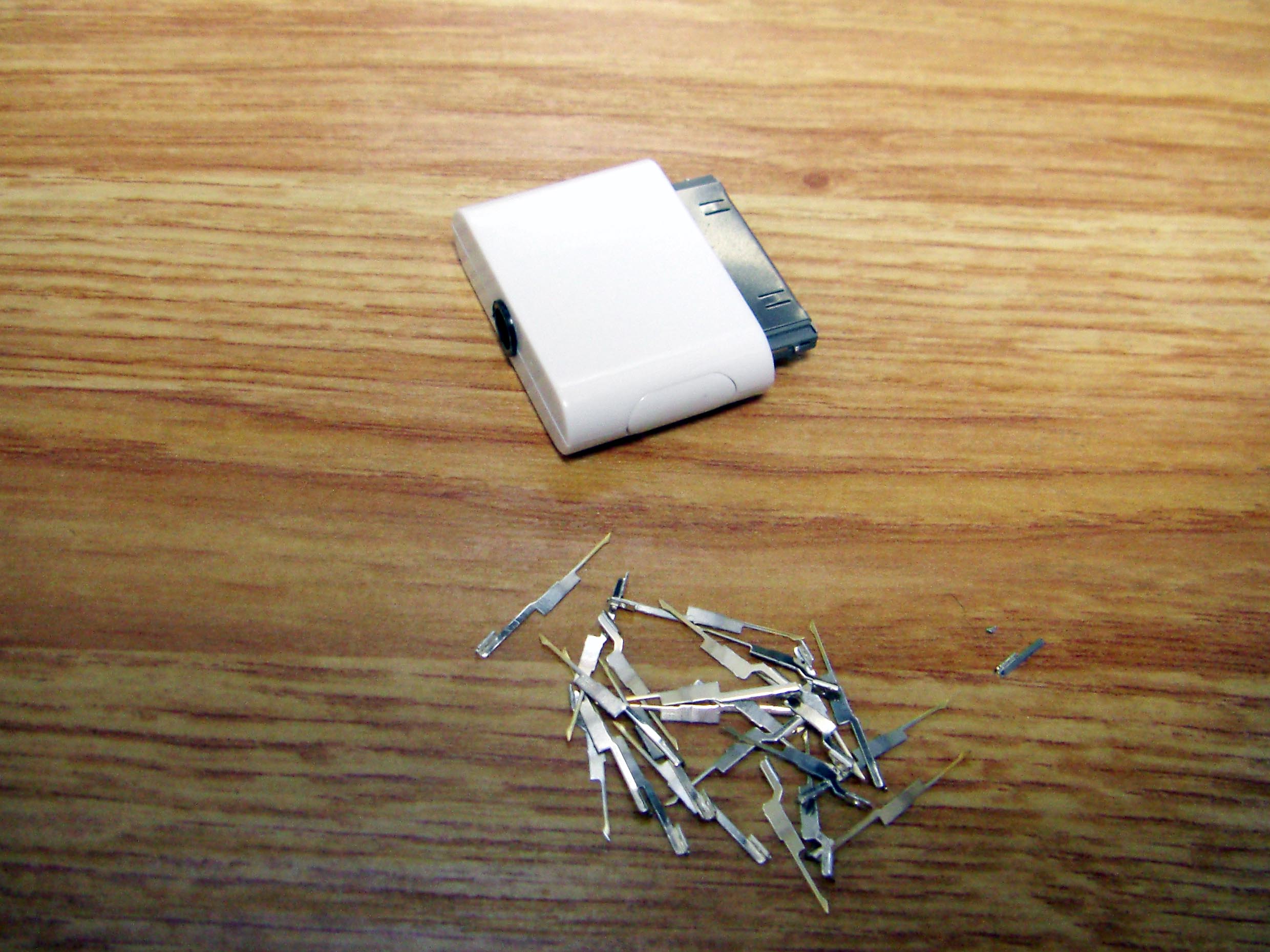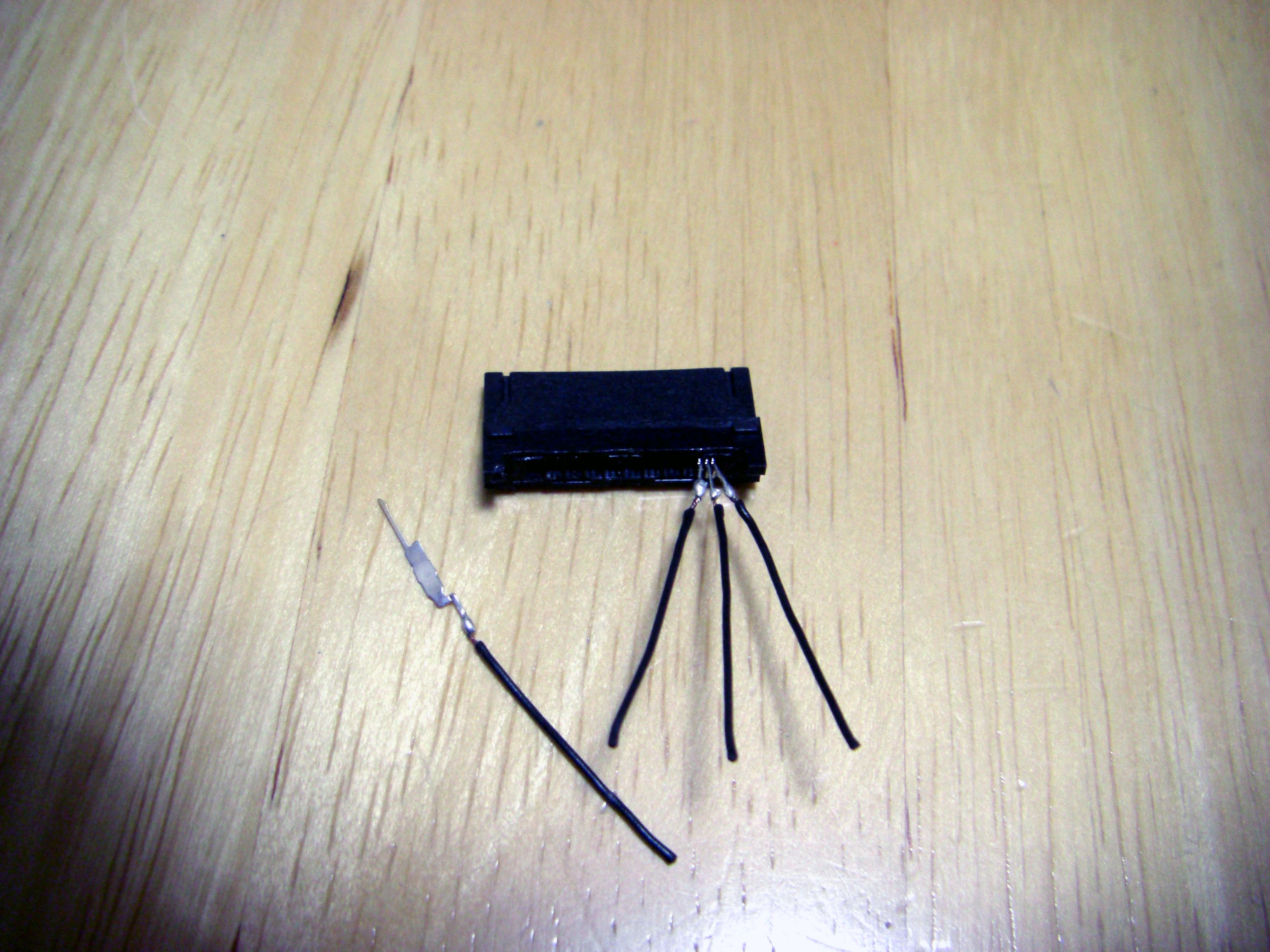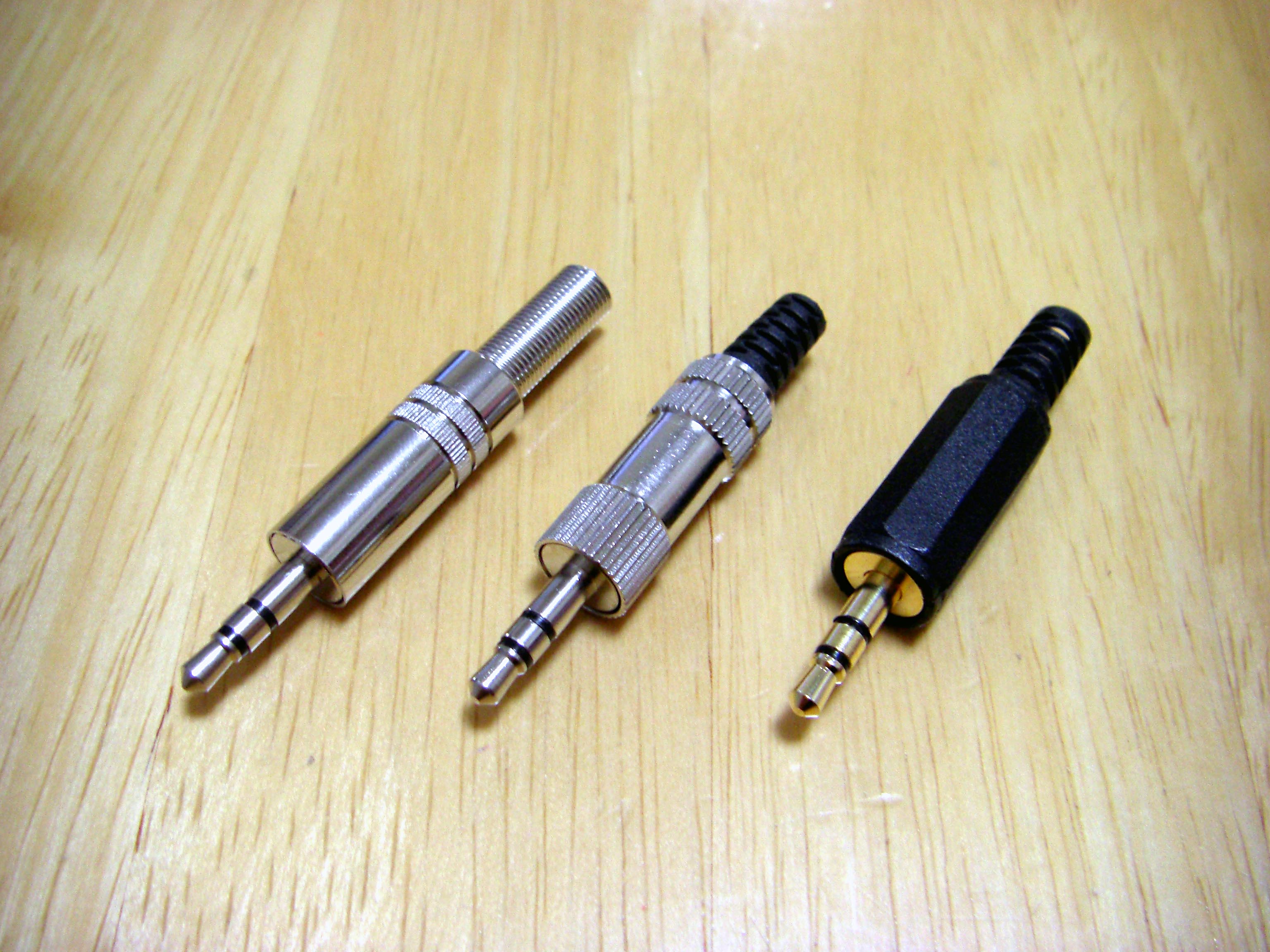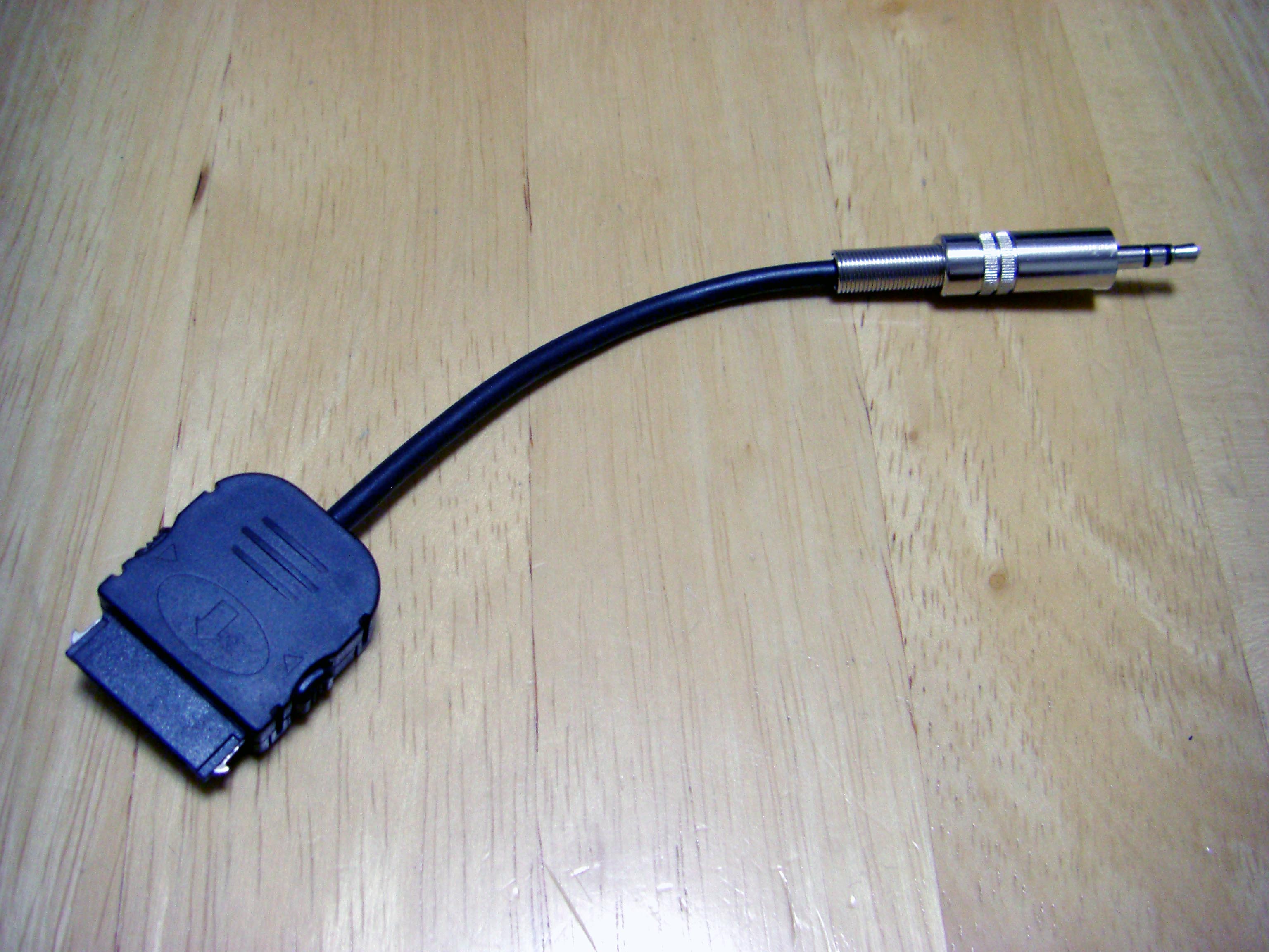 iPod Dock ケーブル を作ろう! まずは部品集め Dockケーブルを作る上で一番大事な部品がDockコネクターでしょ。 数年前は入手困難なようでしたが現在では様々なものがWebで見受けられます。 これは秋葉原の千石電商で購入したものです。 iPod標準に近い形状をしています。 こちらは100円ショップで購入したUSB接続のコネクター。 充電とデータ転送が可能。 とにかく安い(笑) 分解するとこんな感じ。 必要最小限の端子しか付いていません。 今回これを使うことにしました。 LineOUTは3本あれば十分です。 このコネクターには4本の端子があります。 端子部分を取り出しUSB用になっていたピンを抜いてLineOUT用に差し替えたところです。 ピン配列は http://www.lost-reflections.com/externdata/ipod.html を参考にしました。 2番がGND 3番がRightOut 4番がLeftOutです。 ピンがすぐ隣なので強度ようか半田ように曲げられていたピンを干渉しないように真直ぐにしました。 内部を千石のと比べてみました。 100円ショップのもののほうが中に余裕があるので工作は楽でしょう。 次にコンデンサー 標準のDockケーブルであれば必要ありませんが、今回はiMod用ということでコンデンサーを内蔵します。 現在当方が所有しているコンデンサー 所有している中から今回は10μFで使用できそうなものを選びました。 左上から 東進 汎用品、ニチコン MUSE(FX)、ニチコン FW、エルナー RBP2 下の段左から ニチコン KW、ニチコン MUSE (BP)、ニチコン FineGold、東進 Jovial 他にも ニチコン KZ、エルナー シルミック2 RFS、エルナー RBD(BP)などもあるが・・・ 取り合えず 東進 Jovialにて作成することにする。 次にケーブル ケーブルは現在、銀系のものを編みこむのが流行のようですが・・・ 手持ちがないので・・・ ベルデンの1503A すずメッキ銅のシールド線 オヤイデのHWS-22 PC OOC(単一方向性結晶無酸素銅線)のシールド線 都合の好い物が手持ちにないのでこの辺を使うしかないかな? 次にプラグ 今回はポータブルヘッドフォンアンプに接続することを前提に3.5mmのステレオタイプを選びました。 今手元にあるもの、何れもメーカー不明 色々漁っていたら・・・ こんなケーブルが数本出てきました。 3.5のプラグが付いているケーブル 手っ取り早く作るにはいいかも。 取り合えず部品はこんなところでしょうか? 配線 内部は狭いので中に入ることを考慮して配線しなくては・・・ ケーブルが真ん中に来るように コンデンサーは東進 Jovialで10μF ケーブルはベルデンの1503Aを使用 裏返した状態 極性があるコンデンサーの場合はDock側が+になります。 ケーブルを固定するためクッション付の両面テープを2枚重ねて貼り付けました。 反対側のカバーも同様 内部にセットした状態 接点部分をホットボンド等で固めるといいと思う。 蓋をして完成 オヤイデのHWS-22にて作成した例 コンデンサーは同じ東進 Jovialで47μFを使用しました。 3.5mmジャックタイプDockコネクターを注文生産しています。 本ページの最後のほうをご覧ください。 千石電商で購入したコネクターをつかい3.5mmジャックタイプのコネクターを作ってみました。 3.5mmのジャックは秋月電子通商で購入 コンデンサーはニチコン MUSE (BP)を使用 接点を必用最小限だけにして必用な部分も短く整えました。 ギリギリですが綺麗に入ります。 完成品 下は引き抜いた接点 ニチコン FineGoldでもう一つ作成 位置関係が明確になったので無駄なく・・・ コネクタ部を半田付け 組立 後は蓋を閉めて完成