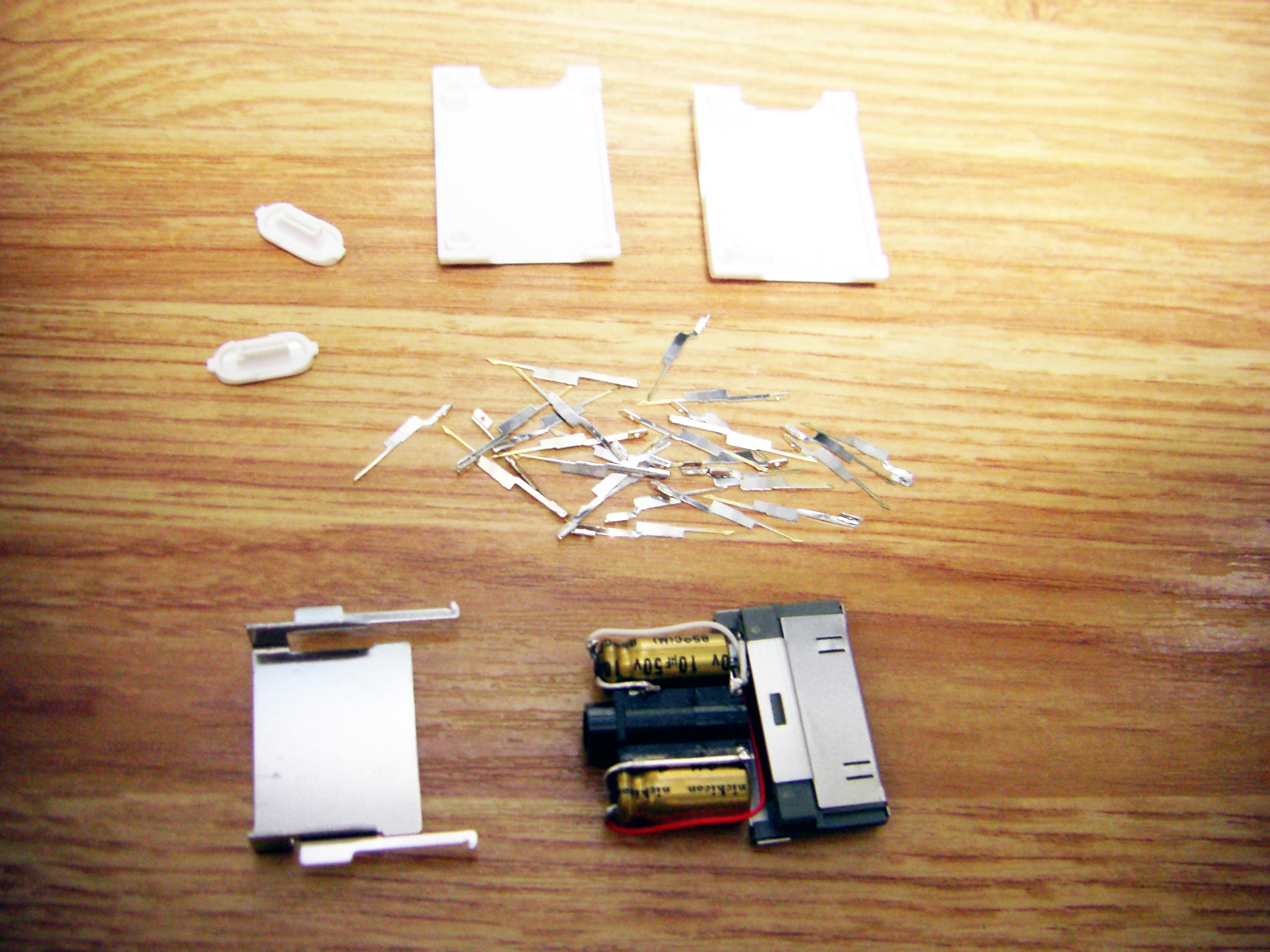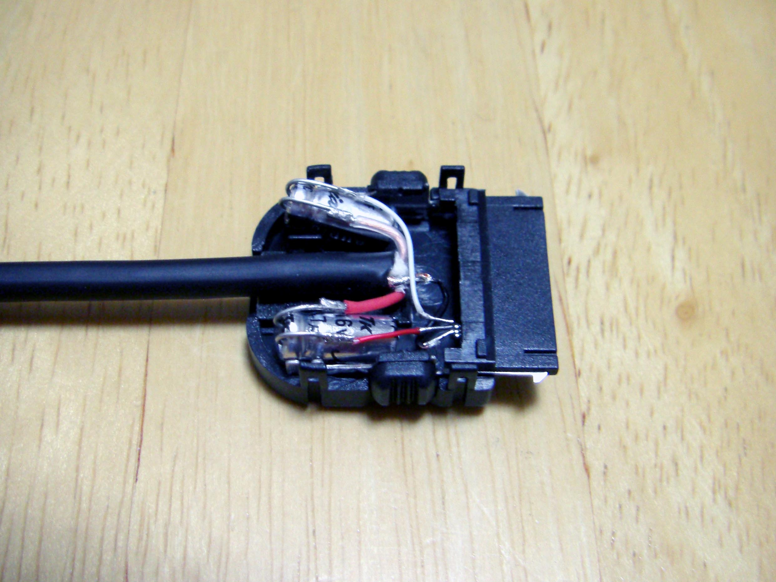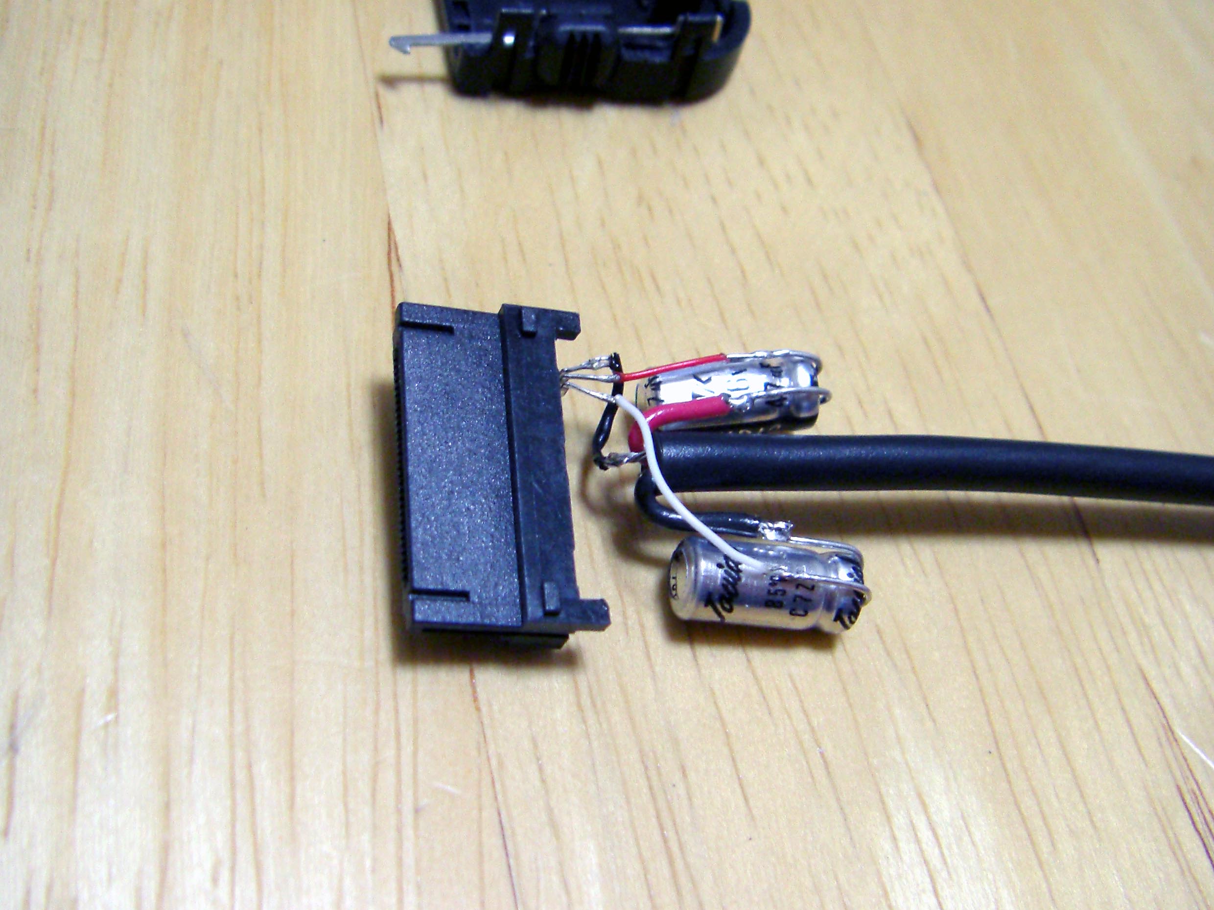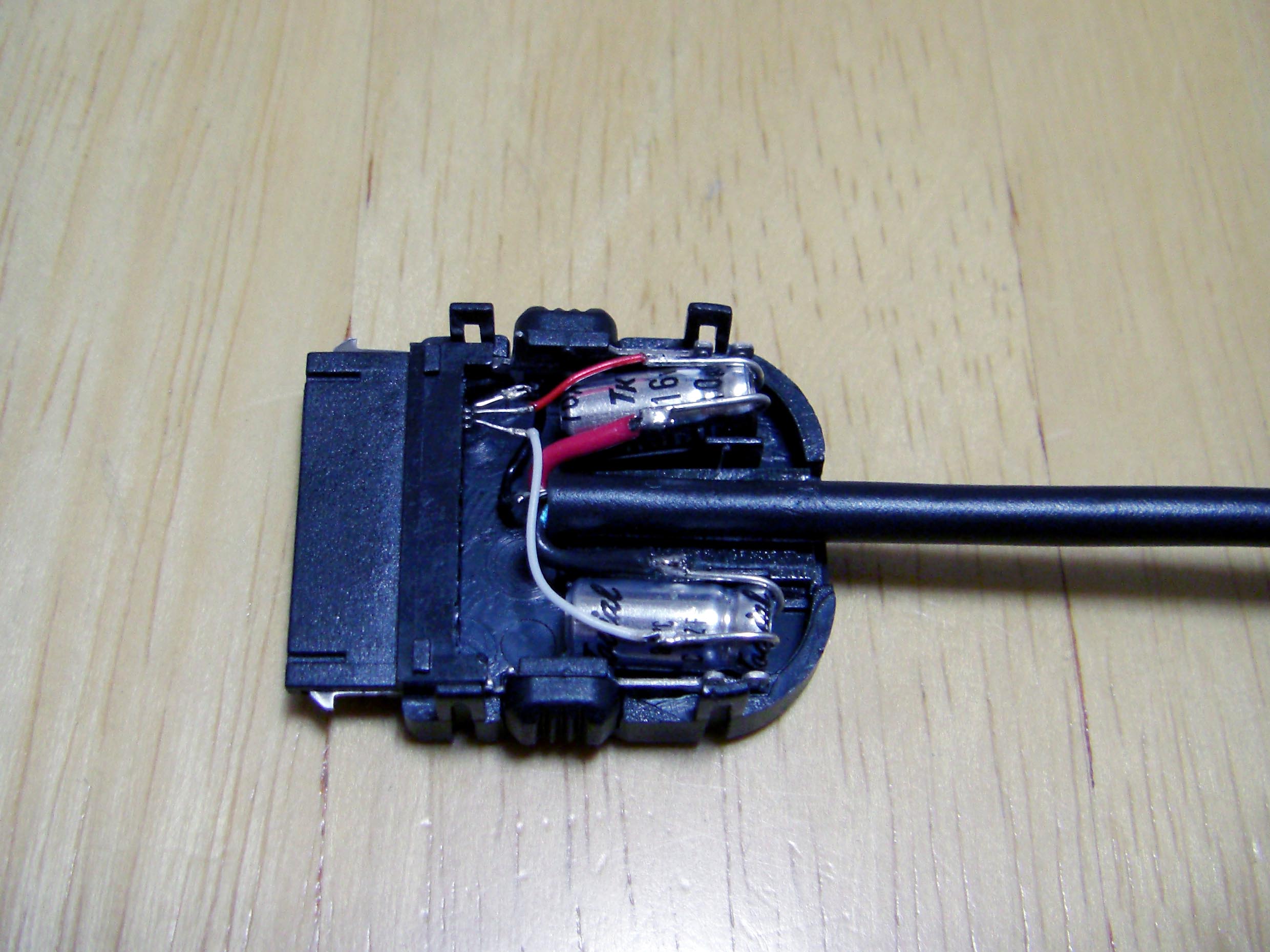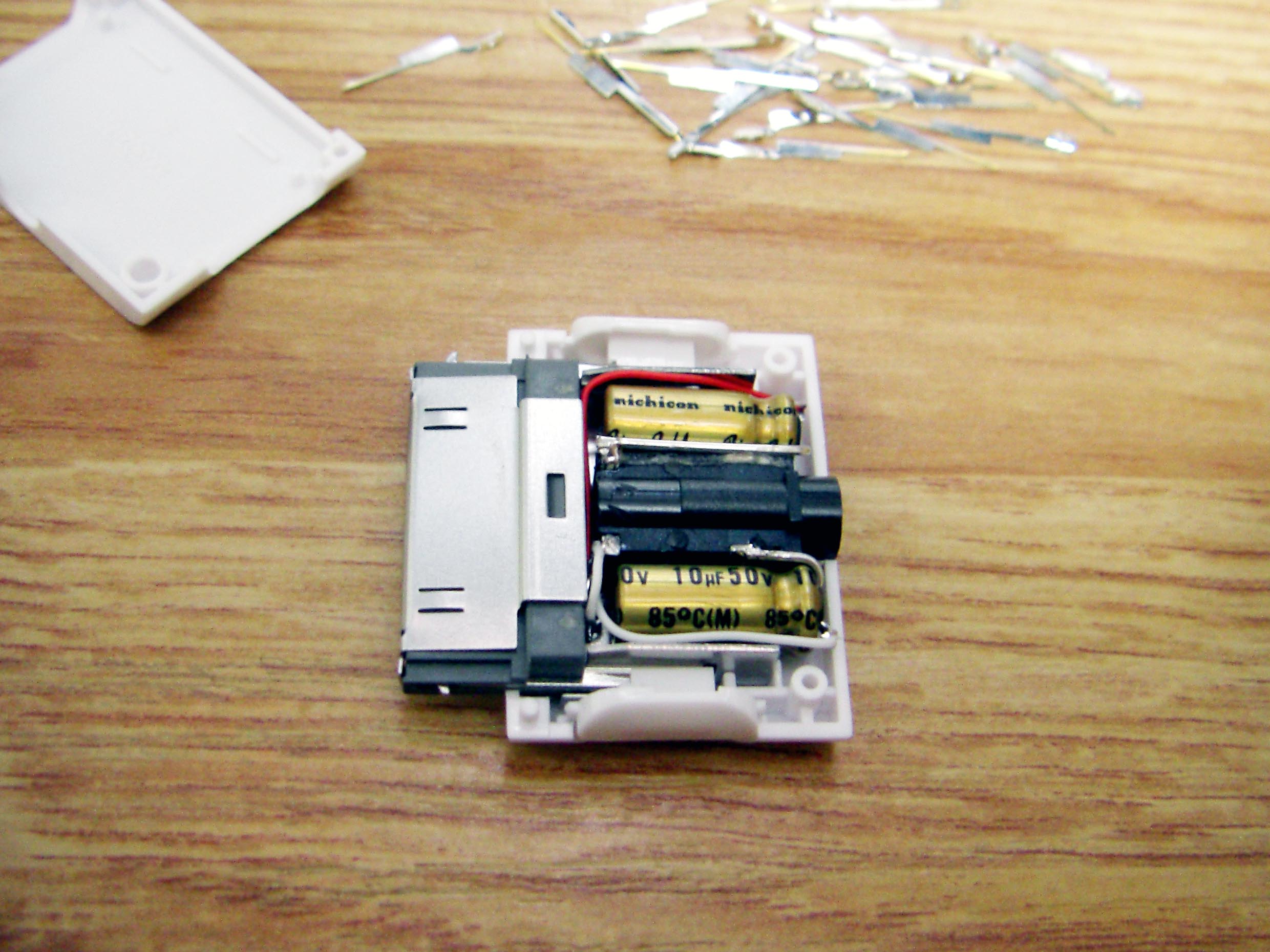 iPod Dock ケーブル を作ろう! まずは部品集め Dockケーブルを作る上で一番大事な部品がDockコネクターでしょ。 数年前は入手困難なようでしたが現在では様々なものがWebで見受けられます。 これは秋葉原の千石電商で購入したものです。 iPod標準に近い形状をしています。 こちらは100円ショップで購入したUSB接続のコネクター。 充電とデータ転送が可能。 とにかく安い(笑) 分解するとこんな感じ。 必要最小限の端子しか付いていません。 今回これを使うことにしました。 LineOUTは3本あれば十分です。 このコネクターには4本の端子があります。 端子部分を取り出しUSB用になっていたピンを抜いてLineOUT用に差し替えたところです。 ピン配列は http://www.lost-reflections.com/externdata/ipod.html を参考にしました。 2番がGND 3番がRightOut 4番がLeftOutです。 ピンがすぐ隣なので強度ようか半田ように曲げられていたピンを干渉しないように真直ぐにしました。 内部を千石のと比べてみました。 100円ショップのもののほうが中に余裕があるので工作は楽でしょう。 次にコンデンサー 標準のDockケーブルであれば必要ありませんが、今回はiMod用ということでコンデンサーを内蔵します。 現在当方が所有しているコンデンサー 所有している中から今回は10μFで使用できそうなものを選びました。 左上から 東進 汎用品、ニチコン MUSE(FX)、ニチコン FW、エルナー RBP2 下の段左から ニチコン KW、ニチコン MUSE (BP)、ニチコン FineGold、東進 Jovial 他にも ニチコン KZ、エルナー シルミック2 RFS、エルナー RBD(BP)などもあるが・・・ 取り合えず 東進 Jovialにて作成することにする。 次にケーブル ケーブルは現在、銀系のものを編みこむのが流行のようですが・・・ 手持ちがないので・・・ ベルデンの1503A すずメッキ銅のシールド線 オヤイデのHWS-22 PC OOC(単一方向性結晶無酸素銅線)のシールド線 都合の好い物が手持ちにないのでこの辺を使うしかないかな? 次にプラグ 今回はポータブルヘッドフォンアンプに接続することを前提に3.5mmのステレオタイプを選びました。 今手元にあるもの、何れもメーカー不明 色々漁っていたら・・・ こんなケーブルが数本出てきました。 3.5のプラグが付いているケーブル 手っ取り早く作るにはいいかも。 取り合えず部品はこんなところでしょうか? 配線 内部は狭いので中に入ることを考慮して配線しなくては・・・ ケーブルが真ん中に来るように コンデンサーは東進 Jovialで10μF ケーブルはベルデンの1503Aを使用 裏返した状態 極性があるコンデンサーの場合はDock側が+になります。 ケーブルを固定するためクッション付の両面テープを2枚重ねて貼り付けました。 反対側のカバーも同様 内部にセットした状態 接点部分をホットボンド等で固めるといいと思う。 蓋をして完成 オヤイデのHWS-22にて作成した例 コンデンサーは同じ東進 Jovialで47μFを使用しました。 3.5mmジャックタイプDockコネクターを注文生産しています。 本ページの最後のほうをご覧ください。 千石電商で購入したコネクターをつかい3.5mmジャックタイプのコネクターを作ってみました。 3.5mmのジャックは秋月電子通商で購入 コンデンサーはニチコン MUSE (BP)を使用 接点を必用最小限だけにして必用な部分も短く整えました。 ギリギリですが綺麗に入ります。 完成品 下は引き抜いた接点 ニチコン FineGoldでもう一つ作成 位置関係が明確になったので無駄なく・・・ コネクタ部を半田付け 組立 後は蓋を閉めて完成