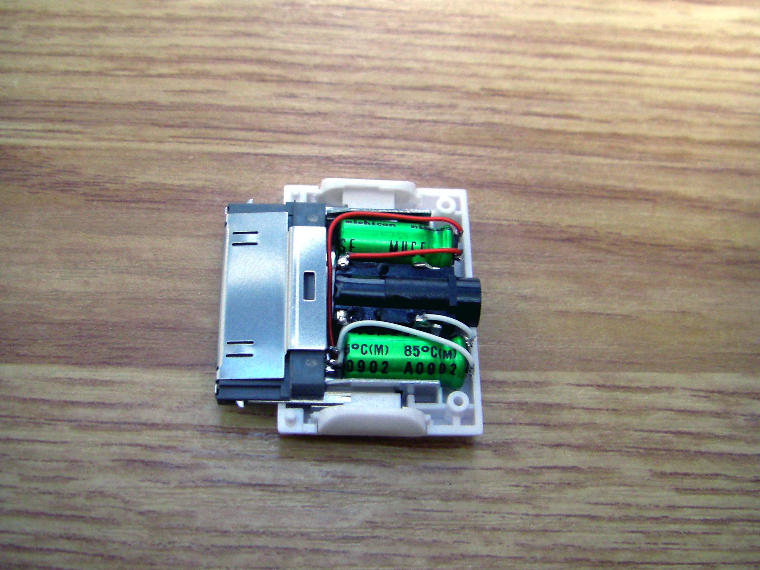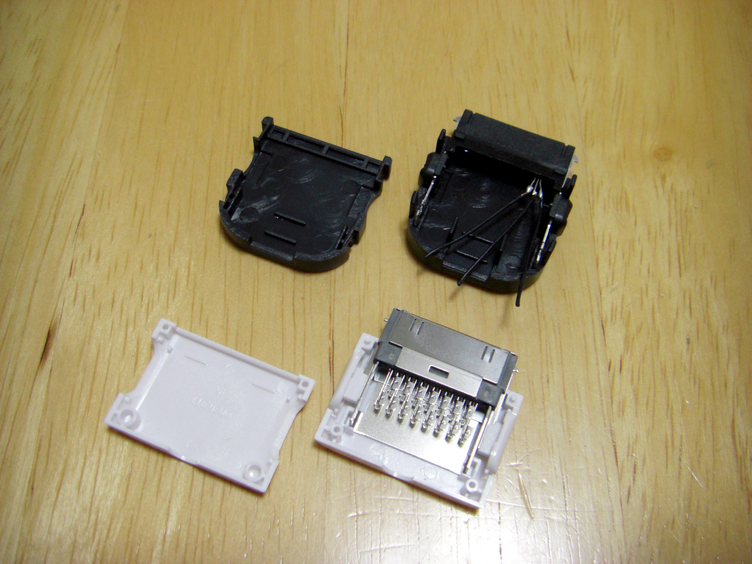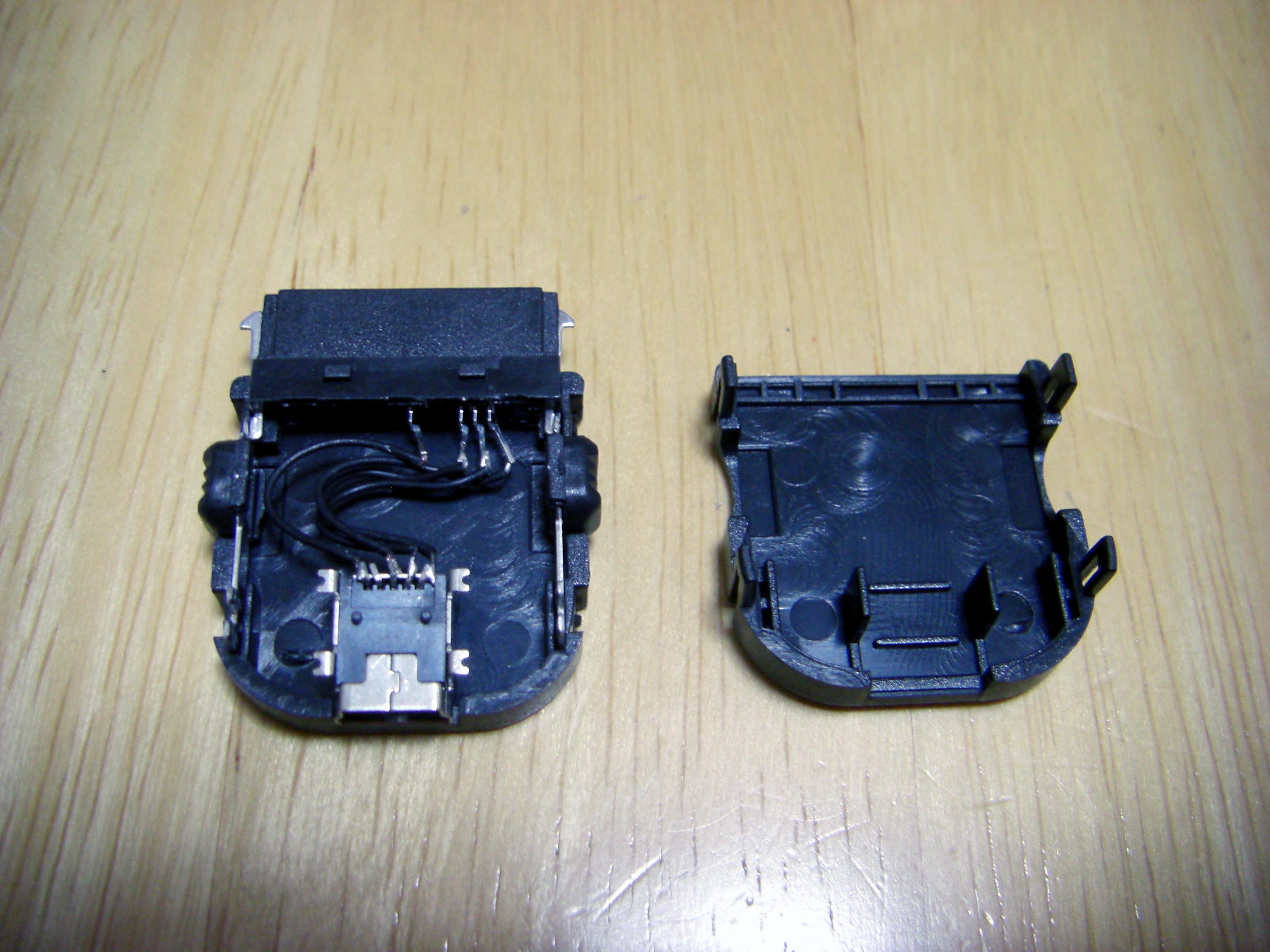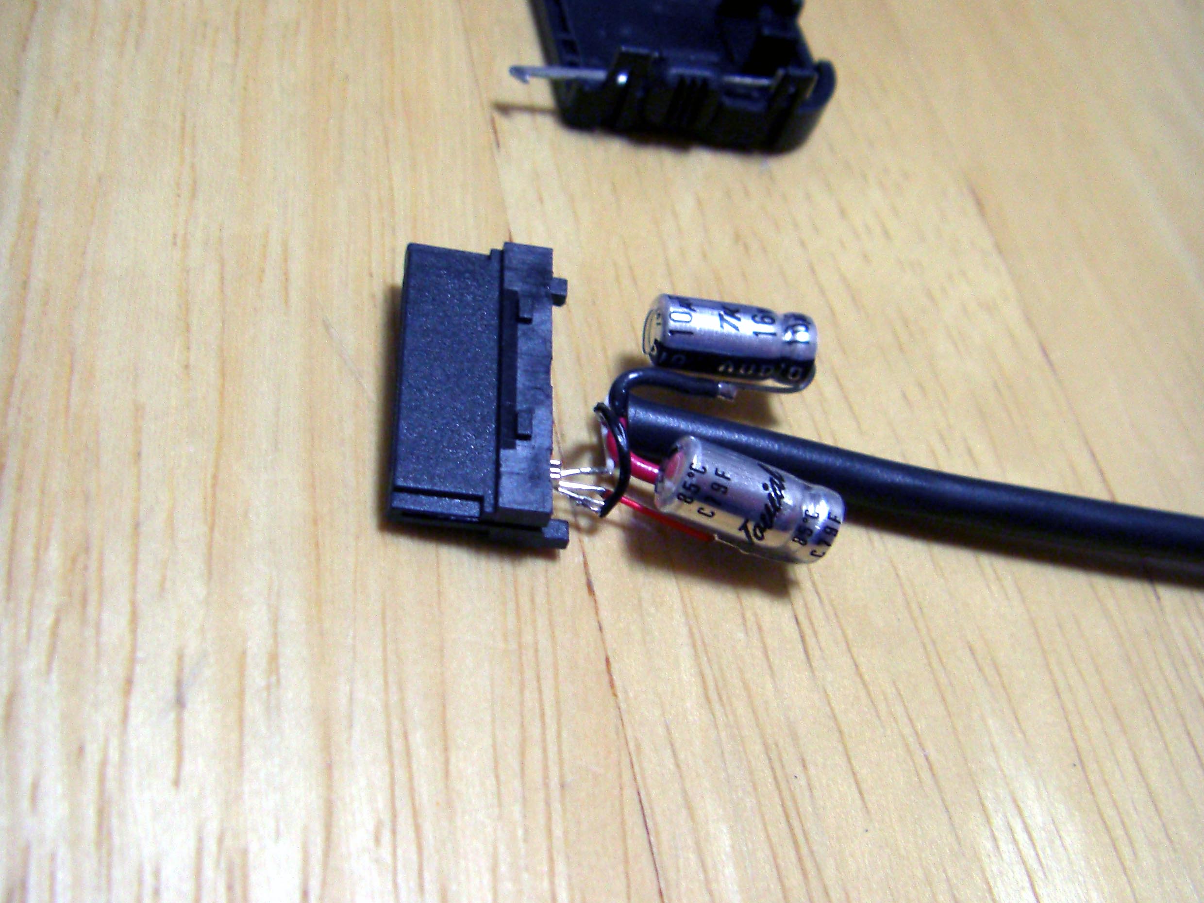 iPod Dock ケーブル を作ろう! まずは部品集め Dockケーブルを作る上で一番大事な部品がDockコネクターでしょ。 数年前は入手困難なようでしたが現在では様々なものがWebで見受けられます。 これは秋葉原の千石電商で購入したものです。 iPod標準に近い形状をしています。 こちらは100円ショップで購入したUSB接続のコネクター。 充電とデータ転送が可能。 とにかく安い(笑) 分解するとこんな感じ。 必要最小限の端子しか付いていません。 今回これを使うことにしました。 LineOUTは3本あれば十分です。 このコネクターには4本の端子があります。 端子部分を取り出しUSB用になっていたピンを抜いてLineOUT用に差し替えたところです。 ピン配列は http://www.lost-reflections.com/externdata/ipod.html を参考にしました。 2番がGND 3番がRightOut 4番がLeftOutです。 ピンがすぐ隣なので強度ようか半田ように曲げられていたピンを干渉しないように真直ぐにしました。 内部を千石のと比べてみました。 100円ショップのもののほうが中に余裕があるので工作は楽でしょう。 次にコンデンサー 標準のDockケーブルであれば必要ありませんが、今回はiMod用ということでコンデンサーを内蔵します。 現在当方が所有しているコンデンサー 所有している中から今回は10μFで使用できそうなものを選びました。 左上から 東進 汎用品、ニチコン MUSE(FX)、ニチコン FW、エルナー RBP2 下の段左から ニチコン KW、ニチコン MUSE (BP)、ニチコン FineGold、東進 Jovial 他にも ニチコン KZ、エルナー シルミック2 RFS、エルナー RBD(BP)などもあるが・・・ 取り合えず 東進 Jovialにて作成することにする。 次にケーブル ケーブルは現在、銀系のものを編みこむのが流行のようですが・・・ 手持ちがないので・・・ ベルデンの1503A すずメッキ銅のシールド線 オヤイデのHWS-22 PC OOC(単一方向性結晶無酸素銅線)のシールド線 都合の好い物が手持ちにないのでこの辺を使うしかないかな? 次にプラグ 今回はポータブルヘッドフォンアンプに接続することを前提に3.5mmのステレオタイプを選びました。 今手元にあるもの、何れもメーカー不明 色々漁っていたら・・・ こんなケーブルが数本出てきました。 3.5のプラグが付いているケーブル 手っ取り早く作るにはいいかも。 取り合えず部品はこんなところでしょうか? 配線 内部は狭いので中に入ることを考慮して配線しなくては・・・ ケーブルが真ん中に来るように コンデンサーは東進 Jovialで10μF ケーブルはベルデンの1503Aを使用 裏返した状態 極性があるコンデンサーの場合はDock側が+になります。 ケーブルを固定するためクッション付の両面テープを2枚重ねて貼り付けました。 反対側のカバーも同様 内部にセットした状態 接点部分をホットボンド等で固めるといいと思う。 蓋をして完成 オヤイデのHWS-22にて作成した例 コンデンサーは同じ東進 Jovialで47μFを使用しました。 3.5mmジャックタイプDockコネクターを注文生産しています。 本ページの最後のほうをご覧ください。 千石電商で購入したコネクターをつかい3.5mmジャックタイプのコネクターを作ってみました。 3.5mmのジャックは秋月電子通商で購入 コンデンサーはニチコン MUSE (BP)を使用 接点を必用最小限だけにして必用な部分も短く整えました。 ギリギリですが綺麗に入ります。 完成品 下は引き抜いた接点 ニチコン FineGoldでもう一つ作成 位置関係が明確になったので無駄なく・・・ コネクタ部を半田付け 組立 後は蓋を閉めて完成