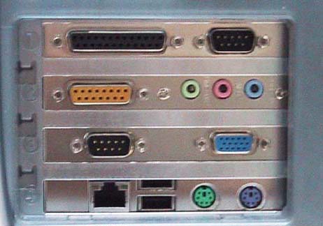 端子拡大 上左からパラレル、シリアル、ゲームポート、サウンドIN/OUT、マイクIN、シリアル、モニター出力、EtherNet、USBX2、マウス、キーボードです。