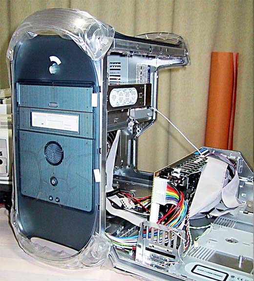 マザーの電源はATX、ATどちらでも使えるようになっています。 実際にはATXの電源をつけました。POWERスイッチ部分はG4のオリジナルの基盤を外し同サイズの基盤で新たに作成しました。